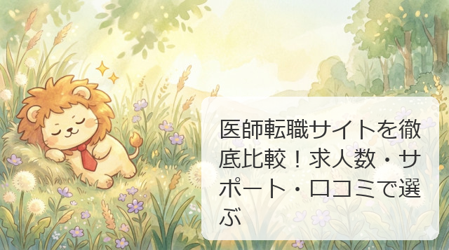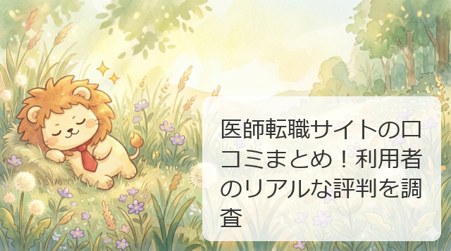 エムスリーキャリアは「求人が多い」「レスポンスが早い」、マイナビDOCTORは「丁寧なサポート」「独占求人が良かった」、民間医局は「非常勤探しに最適」という声が多いよ。